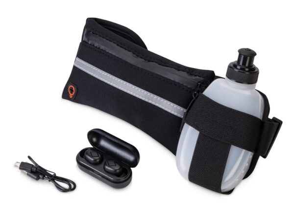 В комплекте — небольшая бутылочка с удобной поилкой, которая поможет вам перевести дух во время спринта. Бутылочка крепится к сумке специальной резинкой.