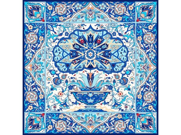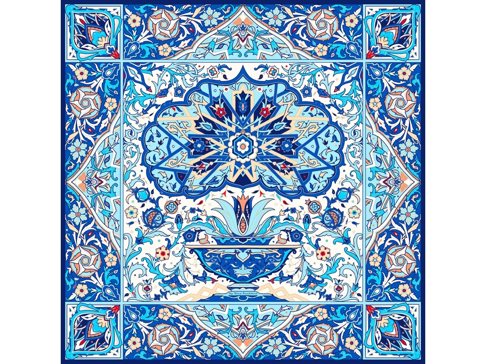 Легкое прикосновение шелка платка «Арабески» по ориентальным мотивам подарит частицу восточной магии. Растительно-геометрический орнамент и уточненная цветовая гамма навеют чарующие образы и сладкие грезы.