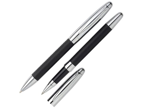Стильный набор, состоящий из шариковой ручки, ручки-роллер и футляра с шильдом, обладает ярким дизайном и сочетанием фактур. Отличный подарок для женщин и мужчин. Ручки и футляр выполнены в единой цветовой гамме.