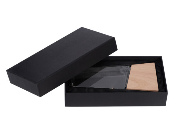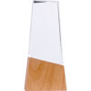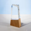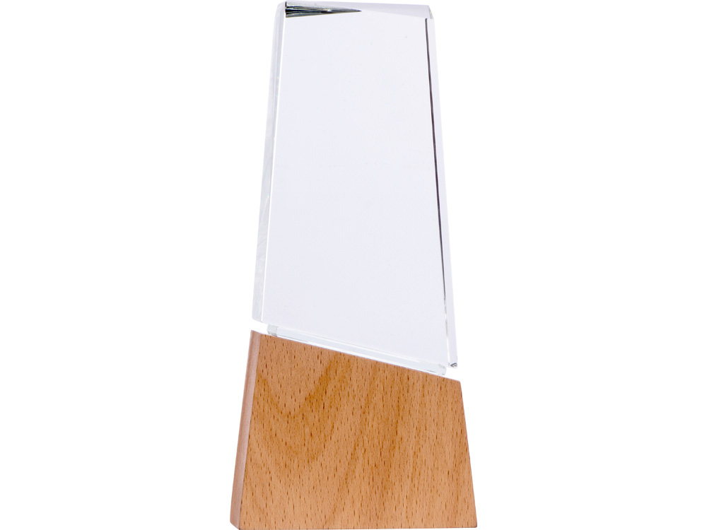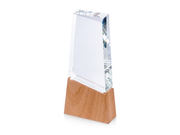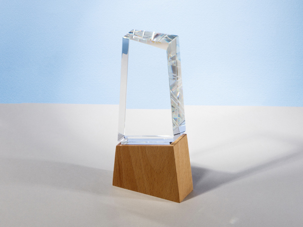 Награда выполнена из прозрачного стекла, имеет необычную форму и расположена на деревянном постаменте. Лаконична и минималистична.
