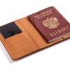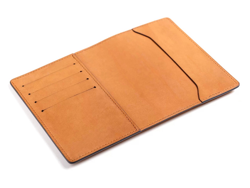 Классическая обложка из дублированной кожи, прокрашенные края, аккуратный шов, прорези для четырёх карт, место для паспорта и документов на машину.