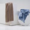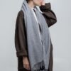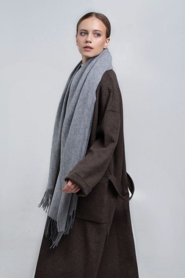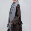 Широкий палантин с едва заметным узором плетения открывает простор фантазии — его можно использовать как шарф, головной убор или декоративный элемент для верхней одежды.