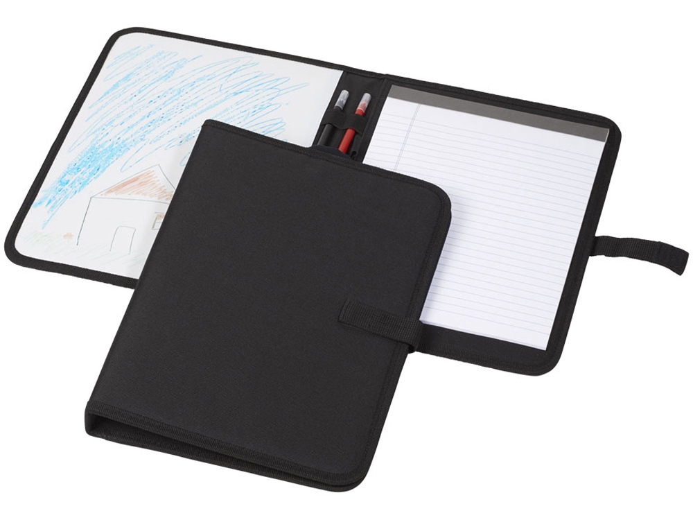 Папка Veela A4. Папка A4 с текстильной застежкой. Включает блокнот с 30 страницами линованной бумаги и доску. В комплект входят маркеры и салфетки. Полиэстер 600D.