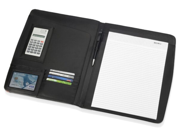 Стильная папка для документов Guidon – прекрасный подарок для делового человека. Папка формата А4 со сменным блокнотом и встроенным калькулятором. Сделана из искусственной кожи, особенно стильный вид ей придает цветная отделка внутри и снаружи. На лицевую сторону можно сделать нанесение шильда или тиснение.