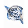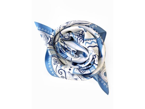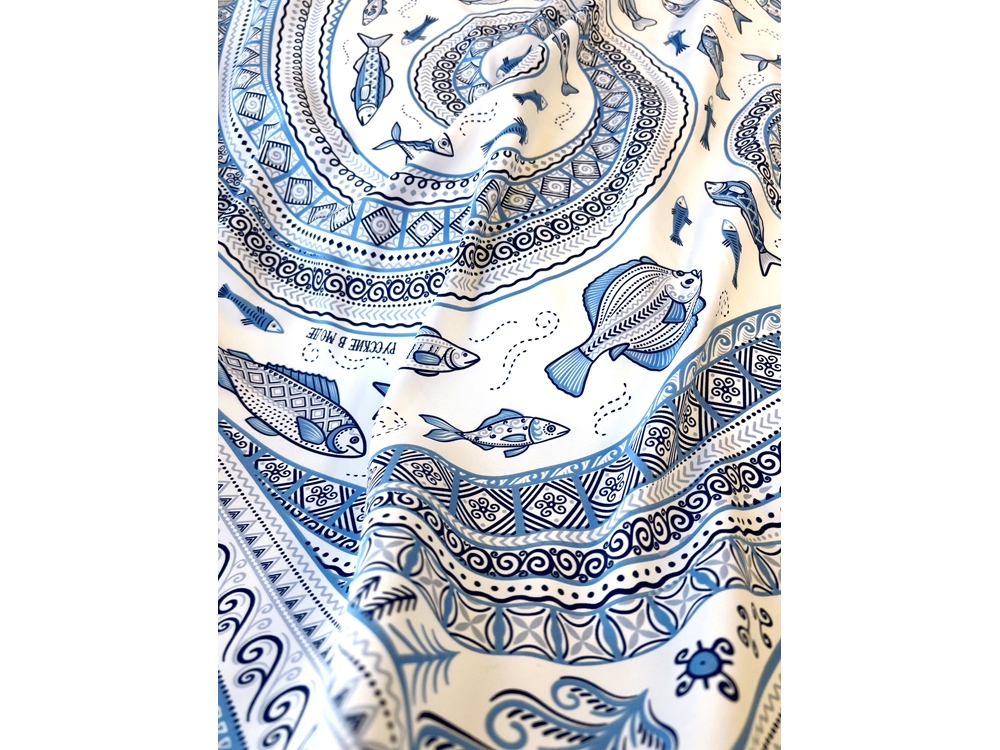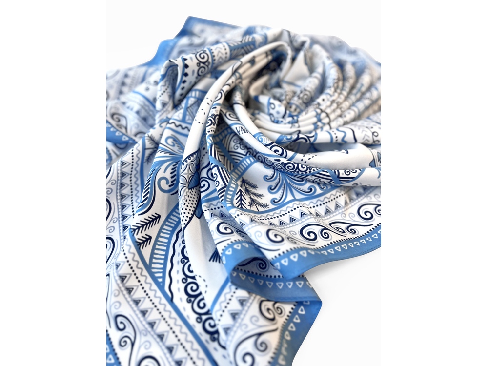 Платок из коллекции бренда «Русские в моде» посвящён уникальному искусству этой росписи. Изображения спиралевидных орнаментов в виде волн, елочек, рыбок украшают дизайн. Все это означает плодородие стихий земли и воды, энергию солнца, богатство и процветание.
