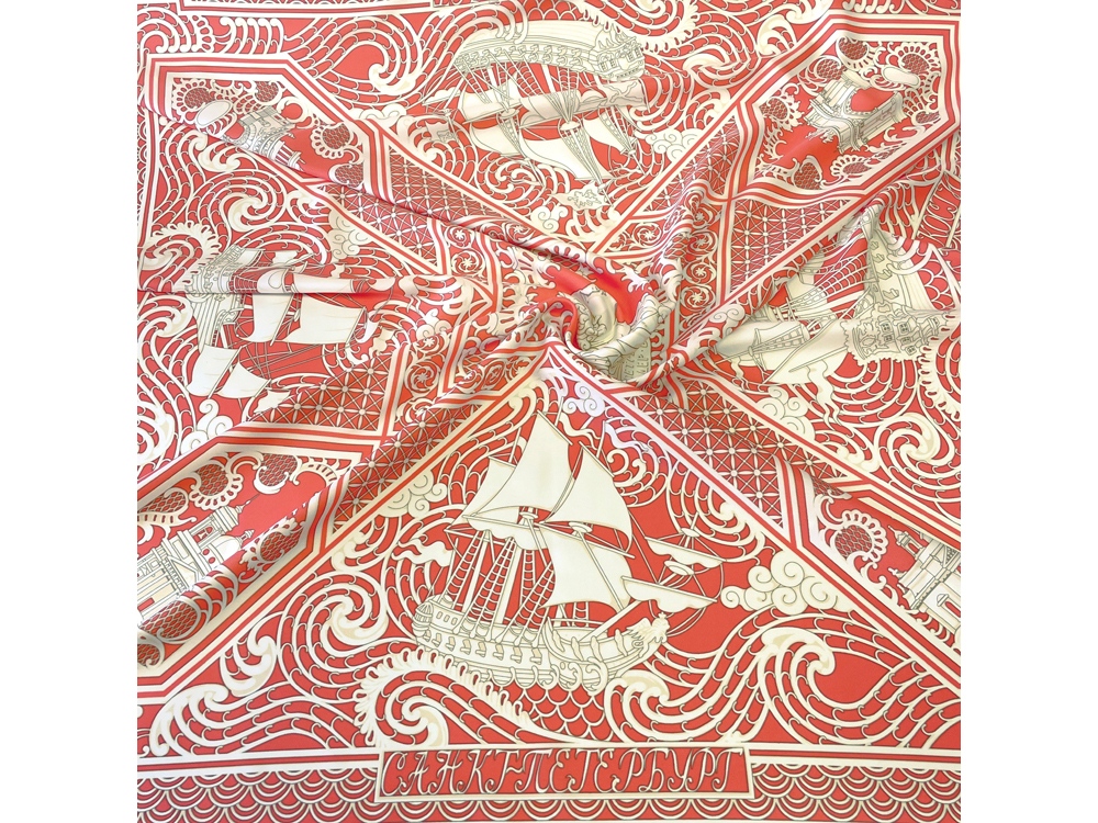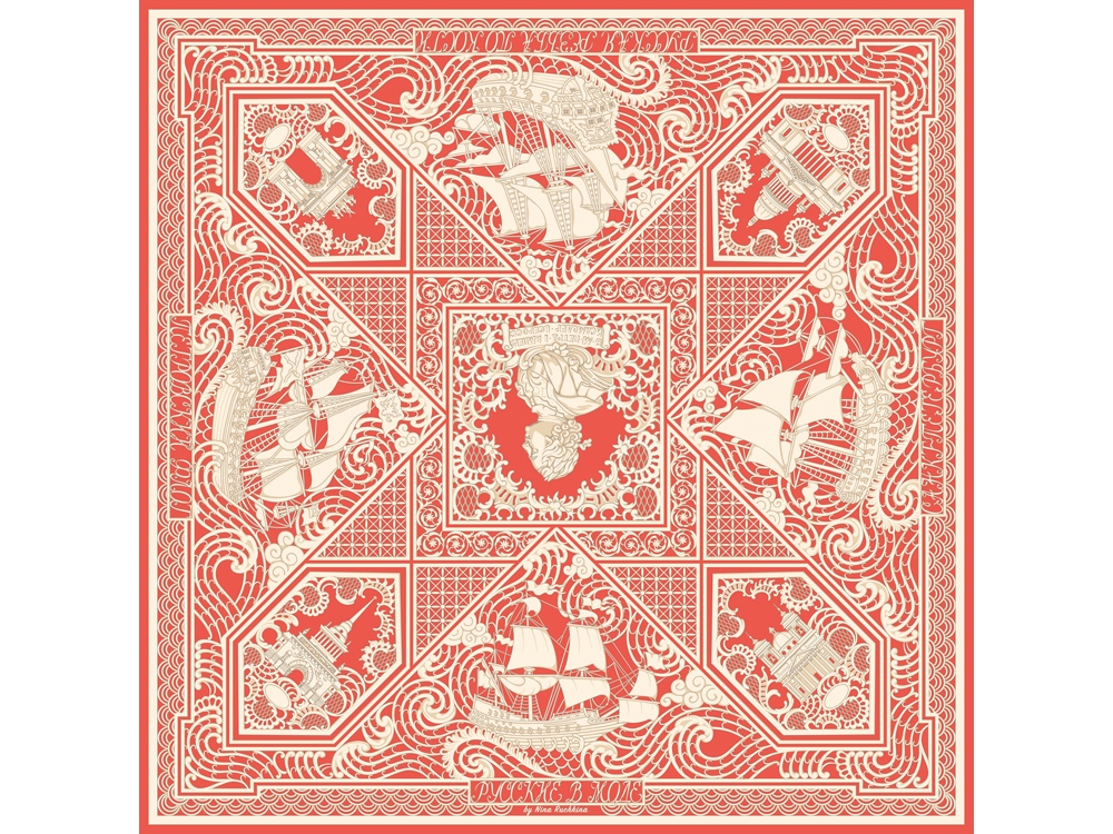 Тематика платка — Петровский Флот. В центре — декоративная резная пластина в пышном обрамлении с профилем великого русского самодержца Петра I.