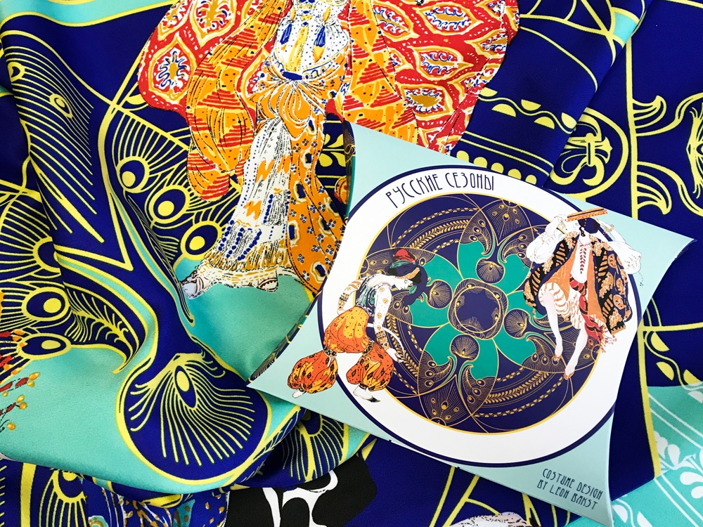 В дизайне платка «Русские сезоны. Лев Бакст» мы воспроизвели эскизы костюмов к таким балетным спектаклям как «Клеопатра», «Шехерезада» и «Послеполуденный сон Фавна», поражающие зрителей своей фантазией, сказочной роскошью, утонченной изысканностью линий, новыми и смелыми сочетаниями красок.