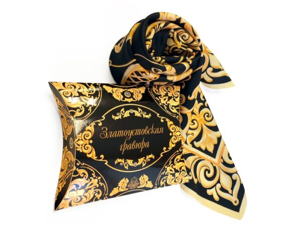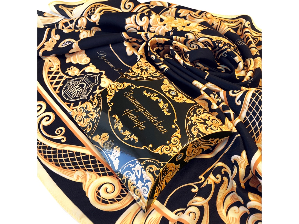 Платок «Златоуствоская гравюра» от бренда «Русские в моде» — это роскошь, изящество и характер, оригинальный аксессуар и настроение праздника, который всегда с Вами.