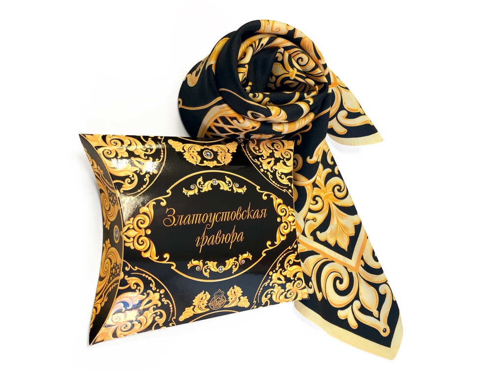 Дамы и господа, вы держите в руках платок «Златоустовская гравюра», дизайн которого сделан совместно с авторами художественных мастерских «Лик».