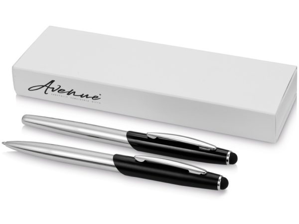 Набор Geneva, включает шариковую ручку-стилус и ручку-роллер. Изящная шариковая ручка-стилус и ручка-роллер с матовой верхней частью и блестящей хромированной нижней частью и соответствующими хромированными вставками. Набор ручек Geneva будет отличным деловым подарком к любому празднику.