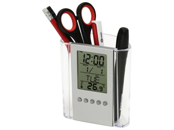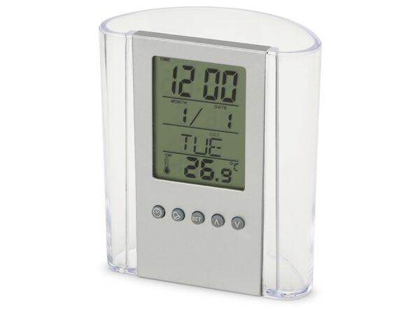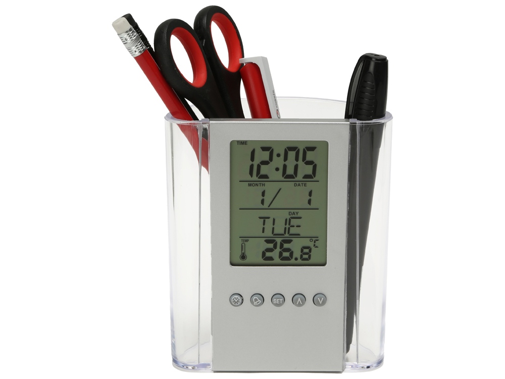 Чрезвычайно практичный элемент Вашего рабочего стола подскажет время, температуру и даже дату, а ещё вместит в себя канцелярские принадлежности. Часы оснащены будильником. Полный порядок на столе плюс комфорт за приемлемую цену.