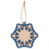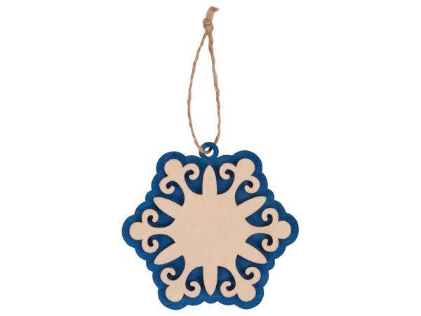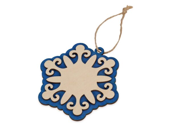 Оригинальное елочное украшение в виде снежинки. Подвеска выполнена из березовой фанеры и тонирована в синий цвет. В центре подвески большая зона для нанесения.