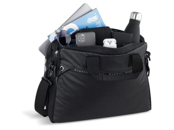 Функциональная организация: 2 основных отделения на молнии с 2 открытыми карманами, 2 держателями для ручек и карманом на молнии, с мягким отделением для ноутбука 15», передний карман на молнии, задний карман на молнии, ремень для крепления к телескопической ручке чемодана, 2 ручки, съёмный регулируемый плечевой ремень (до 135 см).