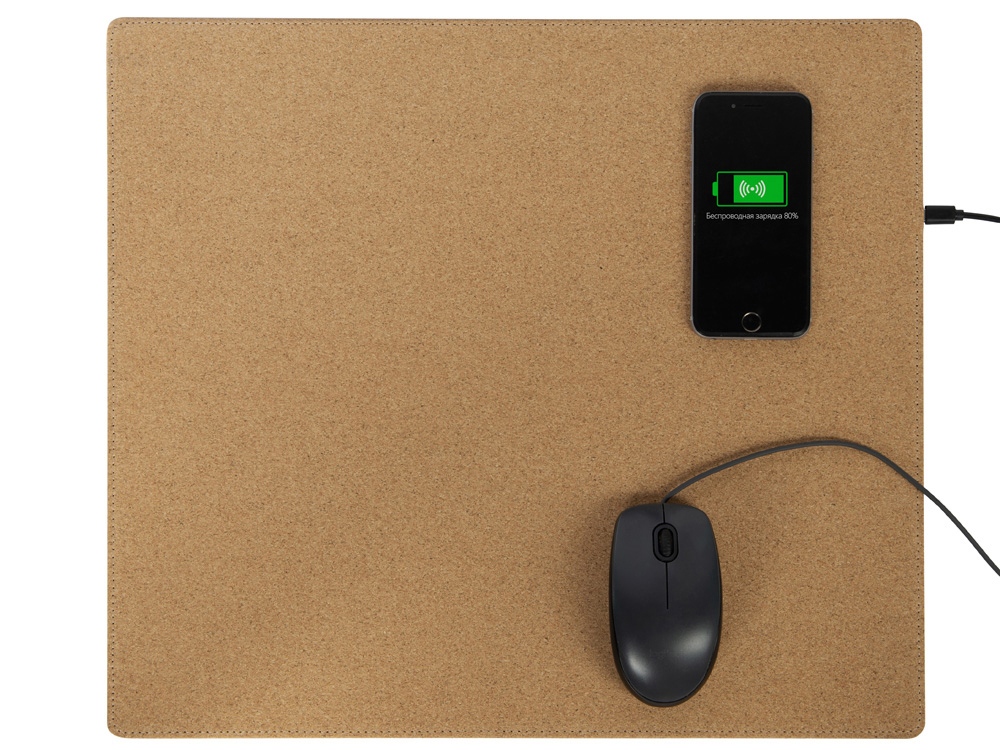 Большой (45 х 40 см) коврик из пробки для мышки, который может заряжать Qi-совместимые устройства методом беспроводной зарядки. Коврик позволяет разместить не только мышку, но и небольшой ноутбук или планшет. Коврик решает проблему скольжения мышки, обеспечивает бесшумное перемещение мыши по поверхности, позволяет декорировать интересным способом рабочее место. В комплекте длинный зарядный кабель 100 см. Коврик не складывается.
