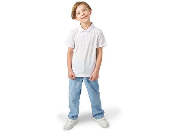 Детская рубашка поло First. Воротник 1х1. Обшивка внутри воротника. Мужская и детская модели с 2 пуговицами, женская — с 4 пуговицами. Пуговицы с гравировкой в тон. Пике, 100% хлопок. 160 г/м².
