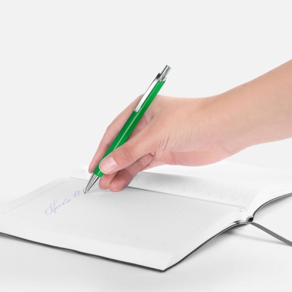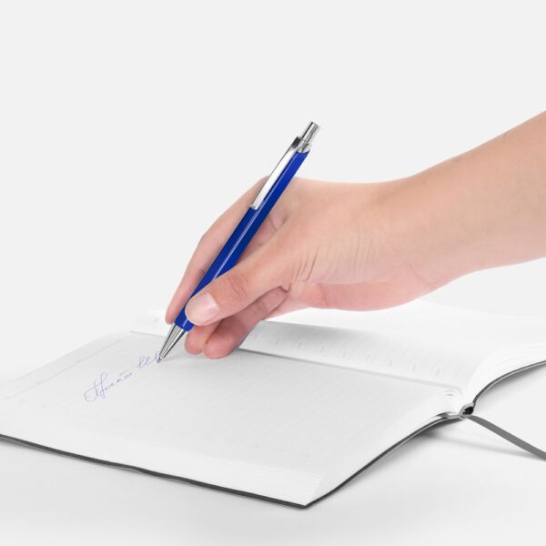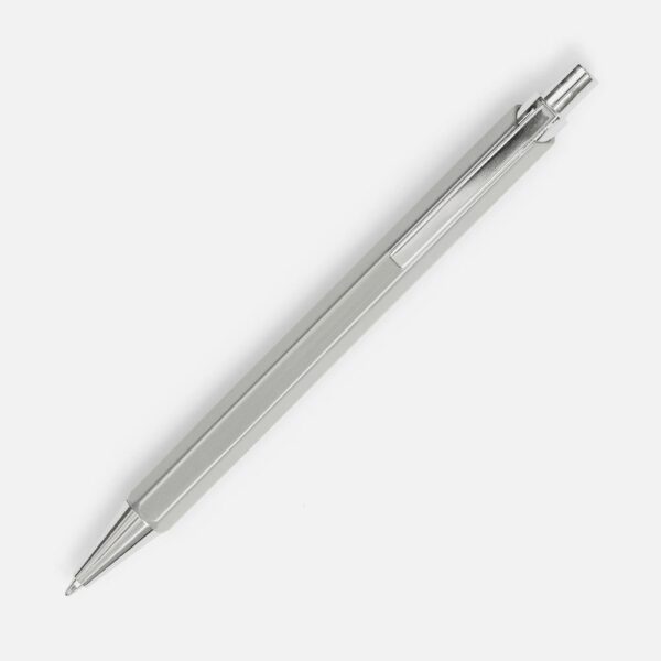 Металлическая шариковая ручка в глянцевом шестигранном корпусе с хромированными деталями.