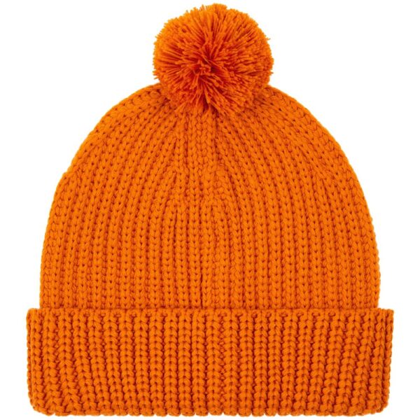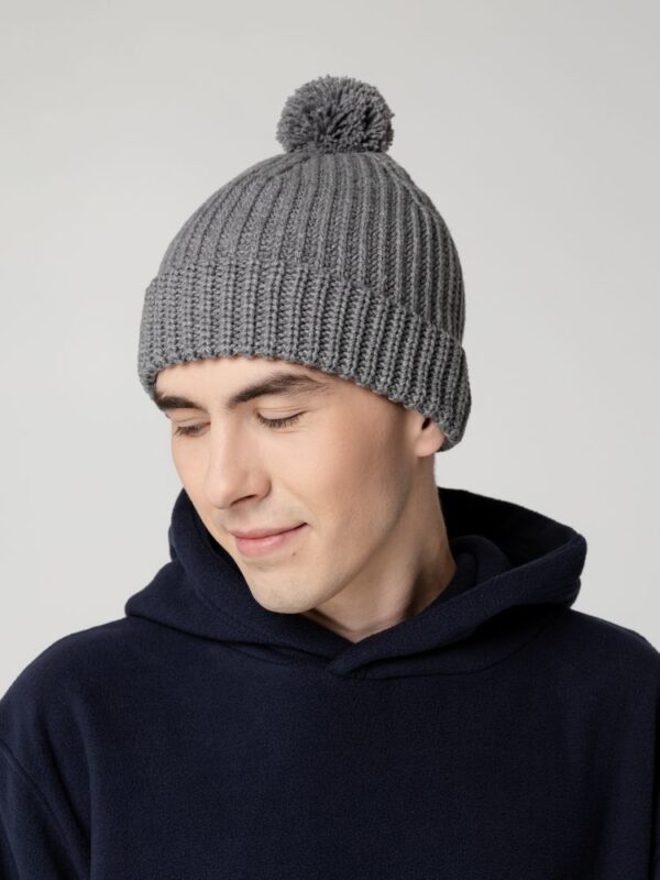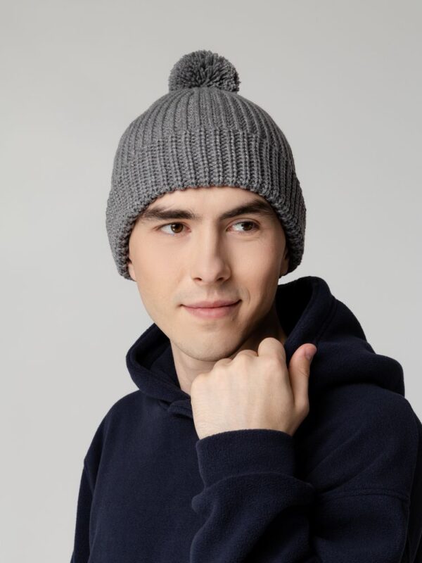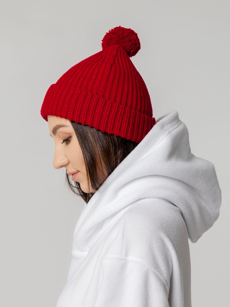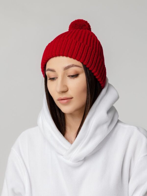 Однослойная шапка из высокообъемной пряжи с помпоном.