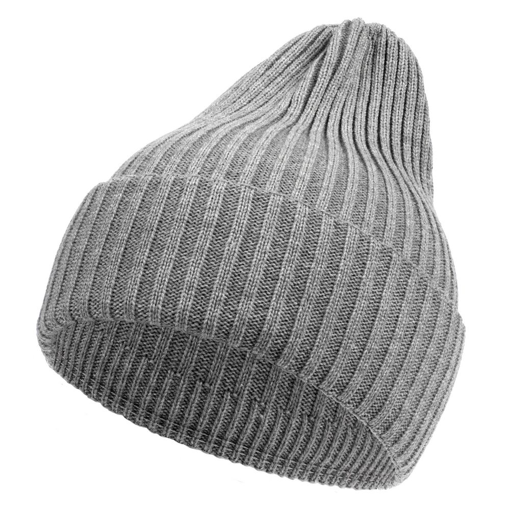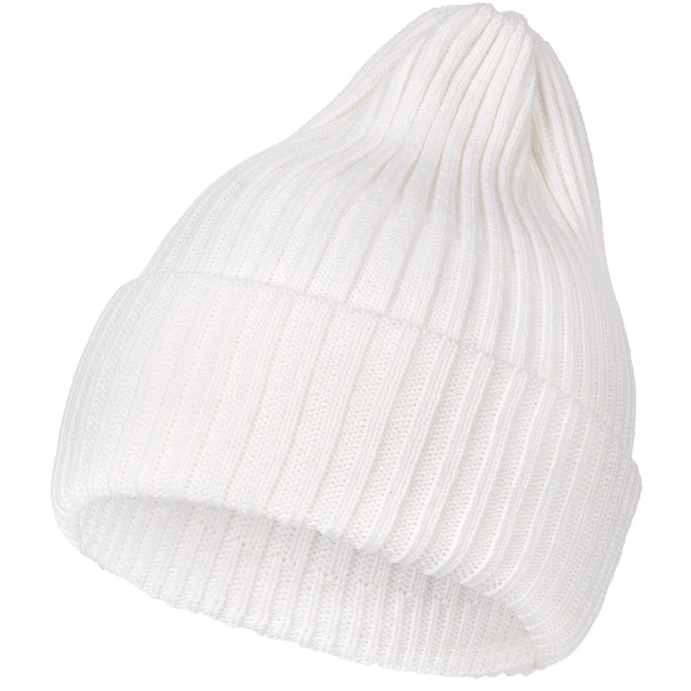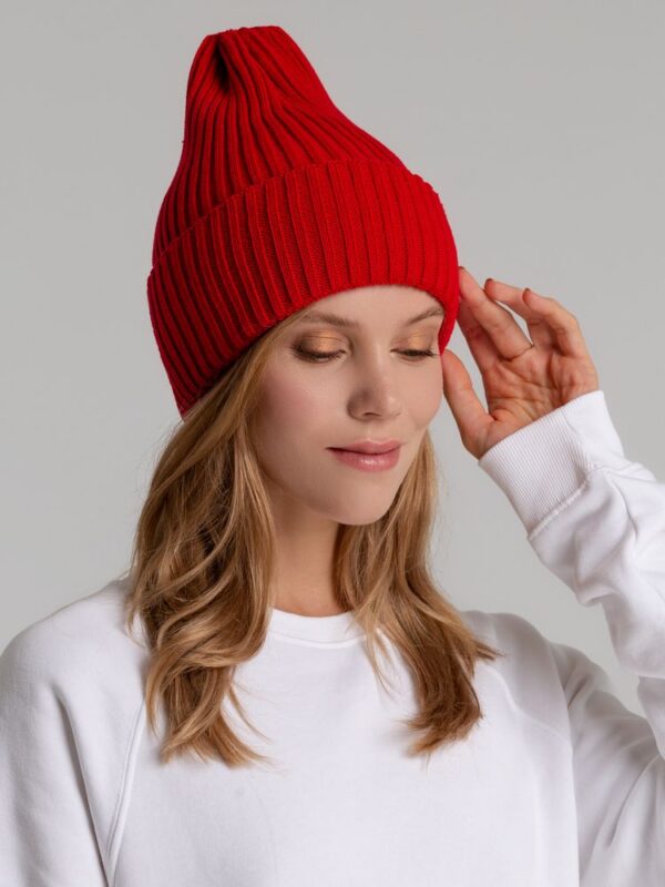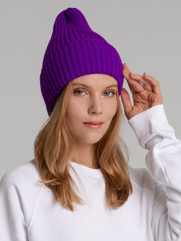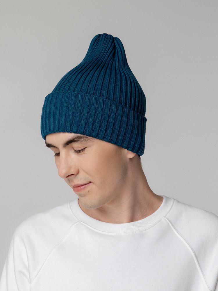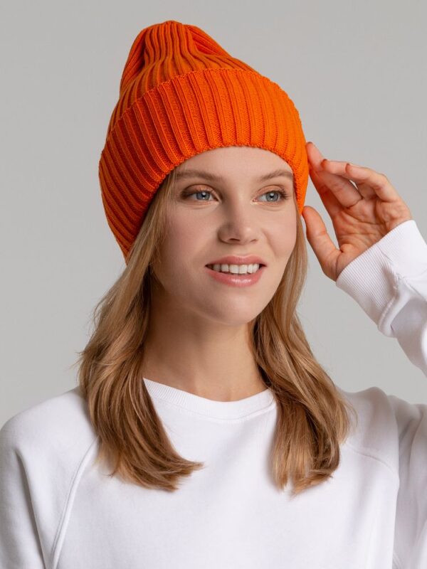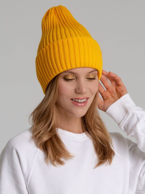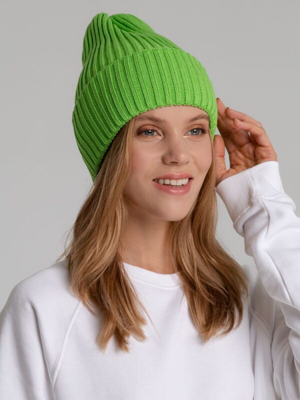 Однослойная шапка фактурной вязки с двойным отворотом.