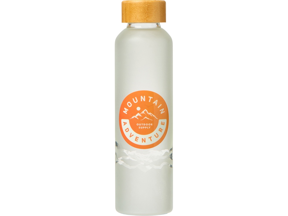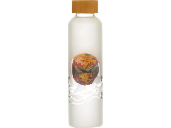 Образец возможностей круговой УФ-печати на матовой бутылке: на корпусе выборочно использовано прозрачное нанесение (силуэты гор и круглое окошко), которое создает интересный эффект.