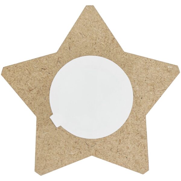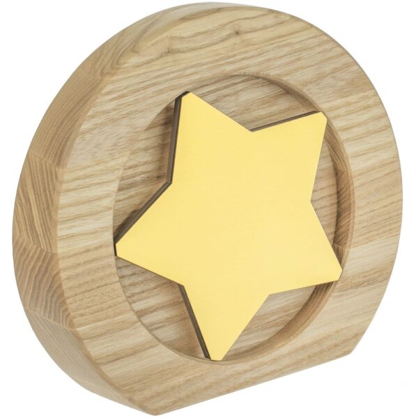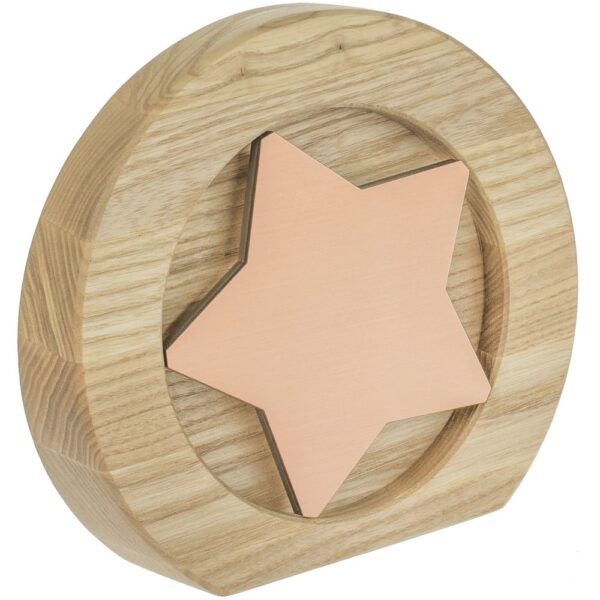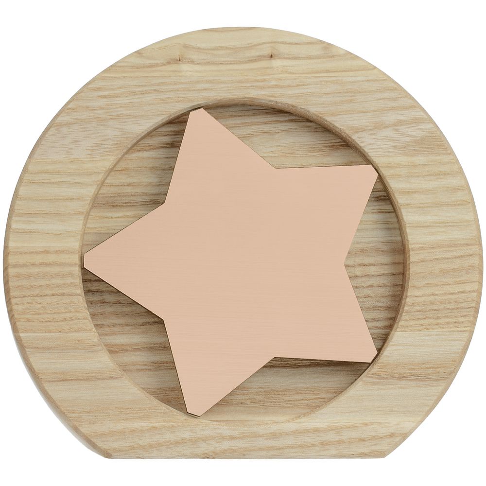 Вставка со звездой из зеркального пластика на деревянной основе крепится на приподнятое основание внутри стелы, что создает объем и многослойность награды. На вставке предусмотрен клеевой слой для крепления после нанесения.