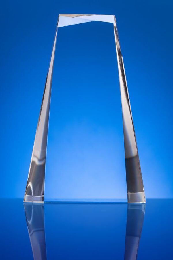 Стела изготовлена из стекла К9, в основе которого лежит оптическое боросиликатное стекло. Эту марку стекла отличает низкий процент посторонних включений, высокий показатель преломления и высокая прозрачность — идеальные качества для изготовления наград премиального уровня.