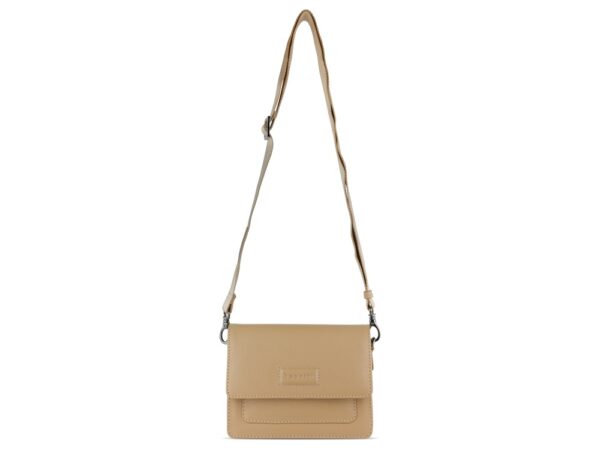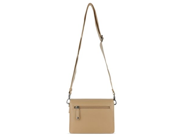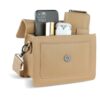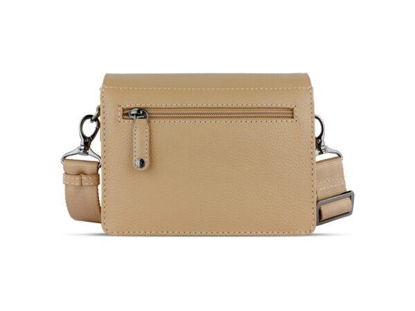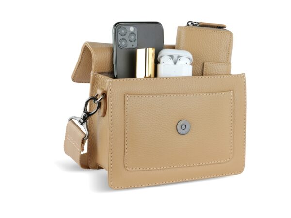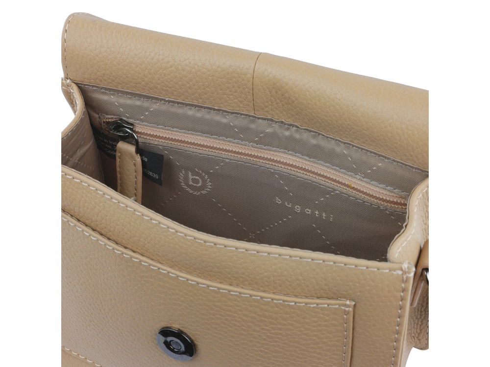 Функциональная организация: основное отделение на магнитной кнопке с карманом на молнии, передний открытый карман, задний карман на молнии, съемный регулируемый плечевой ремень (до 130 см).