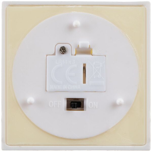 Внутри LED-свеча с теплым светом. Работает от 3 батареек типа LR44 (в комплект не входят).