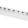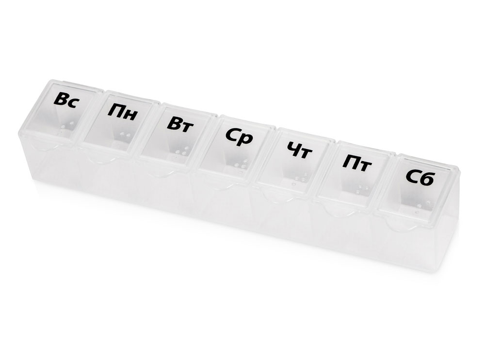 Таблетница с днями недели. Надписи продублированы шрифтом Брайля на английском языке.