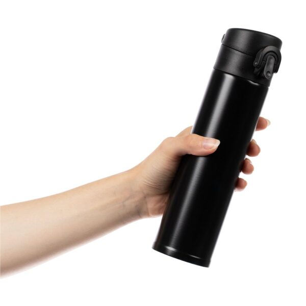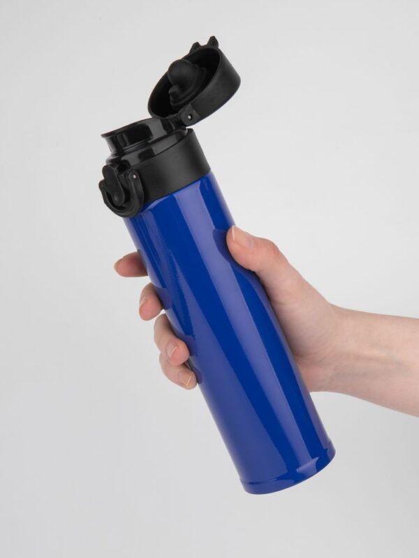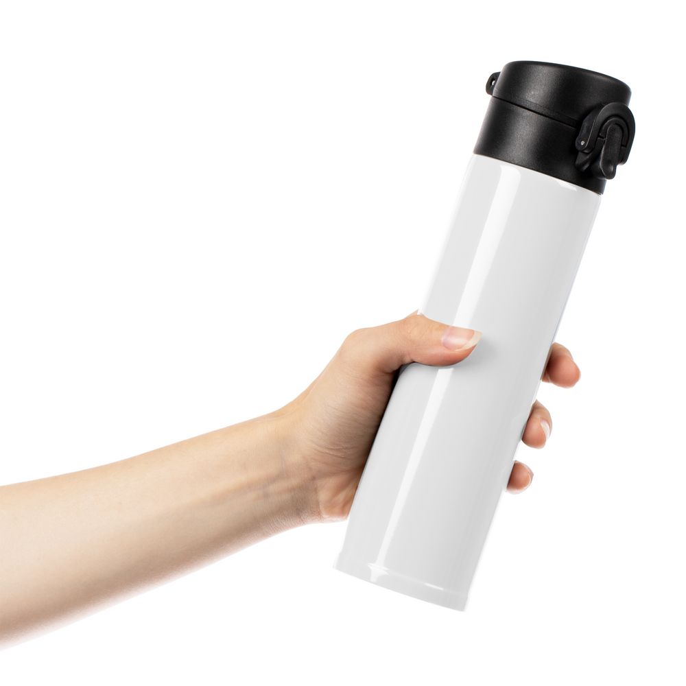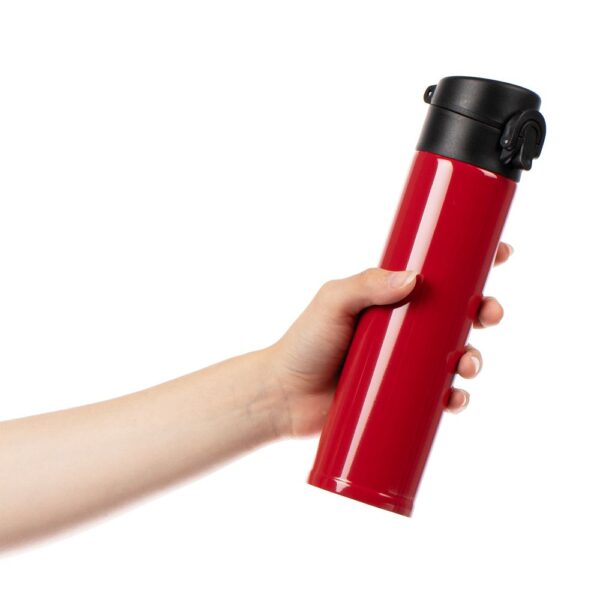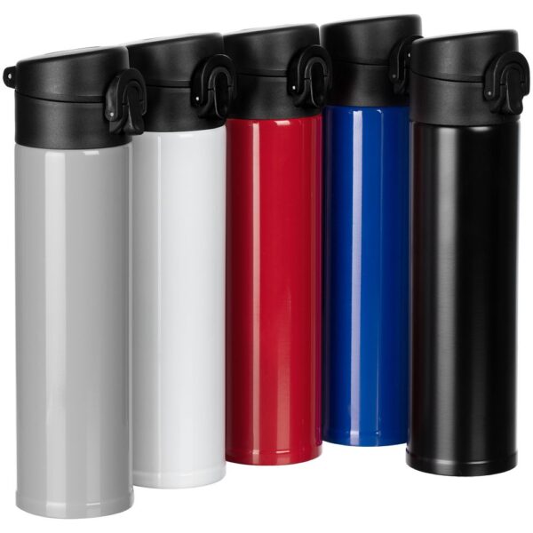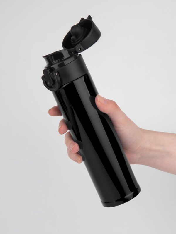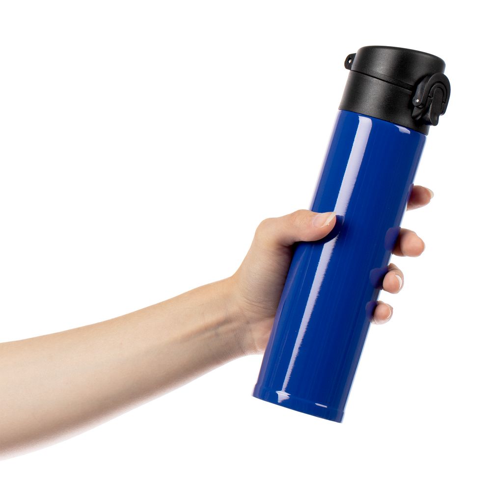 Термостакан Eimer в ровном цилиндрическом корпусе — эстетически приятная форма, на которую удобно делать круговое нанесение. Крышку с отщелкивающимся клапаном легко открыть одной рукой.
