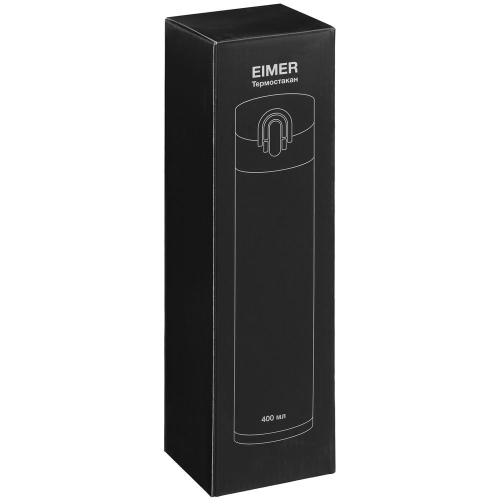 Термостакан Eimer в ровном цилиндрическом корпусе — эстетически приятная форма, на которую удобно делать круговое нанесение. Крышку с отщелкивающимся клапаном легко открыть одной рукой.