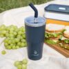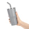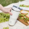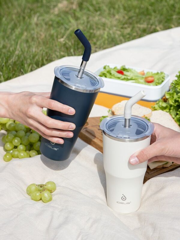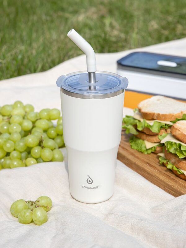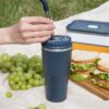 - 2 крышки в комплекте: одна на 100% герметичная с механизмом блокировки отверстия для питья, вторая — с отверстием для трубочки