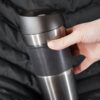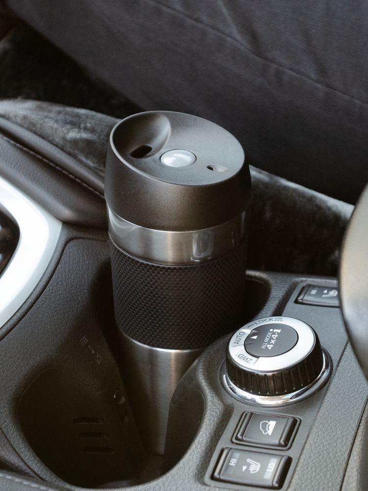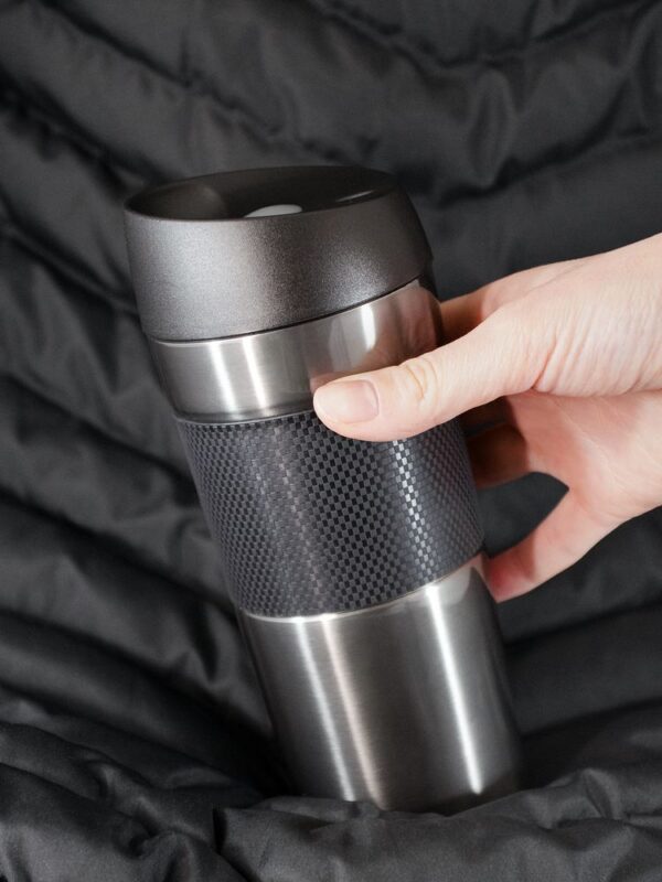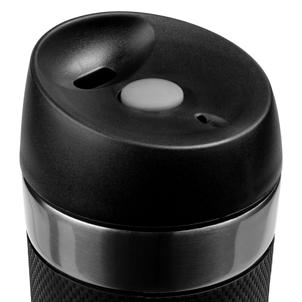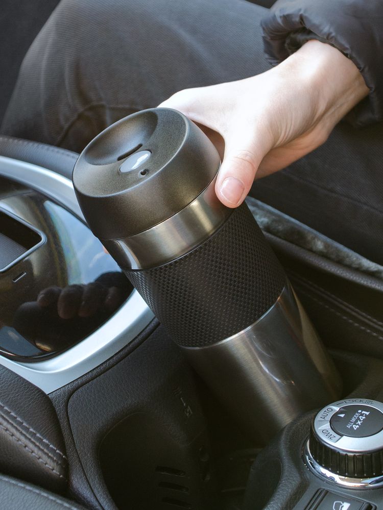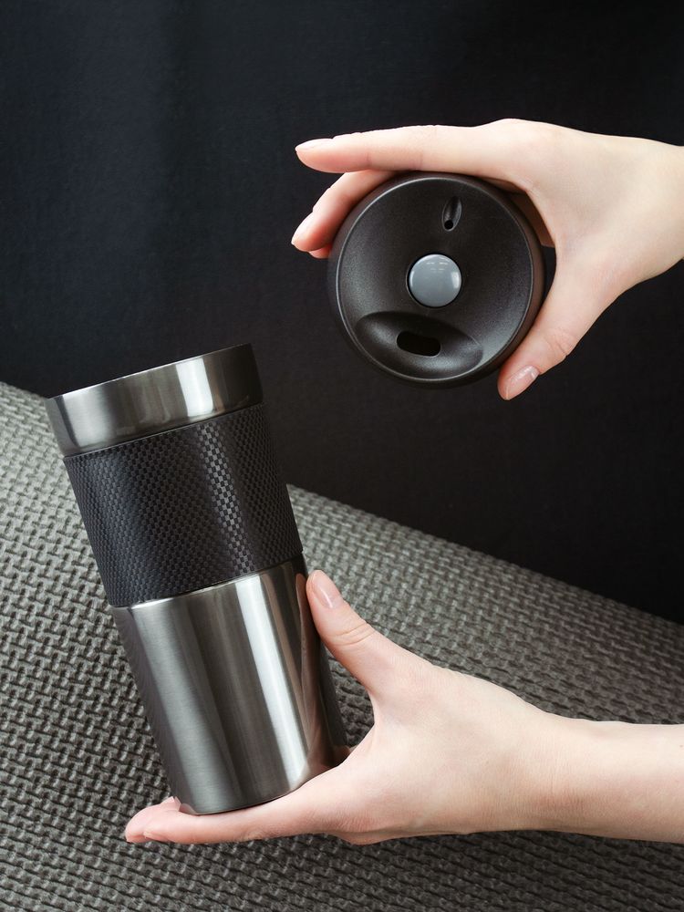 Удобная крышка с кнопкой-закрывашкой и силиконовая манжета на корпусе — все, что нужно, чтобы максимально комфортно пить чай или кофе в дороге.