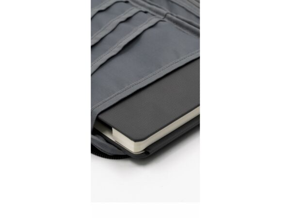 Хороший корпоративный подарок для путешествующих, снабженный многими функциями. Кроме путешествий портмоне можно использовать для хранение карт и документов дома. Выполнен из водостойкого и долговечного переработанного полиэстера с покрытием от загрязнения. Внутреннее отделение вмещает документы формата А5, iPad mini, электронную книгу.