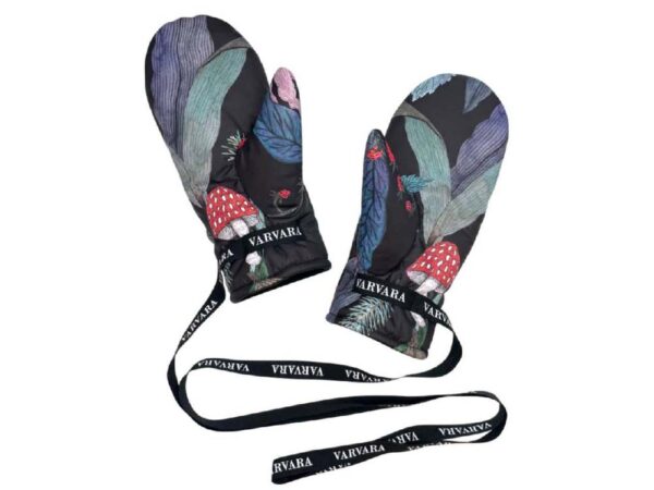 Верхняя ткань выполнена из непромокаемой курточной ткани, внутри флисовый подклад и утеплитель — холлофайбер. Температурный режим до -20 градусов. Варежки на ленте, «как в детстве».