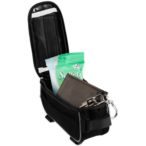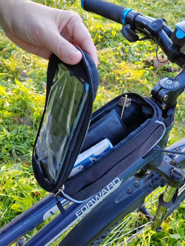 Наружный карман для телефона или навигатора с прозрачным окошком защищает его от падения и намокания, а также позволяет пользоваться сенсорным экраном во время движения. Вмещает телефон с диагональю до 6″.