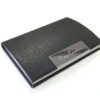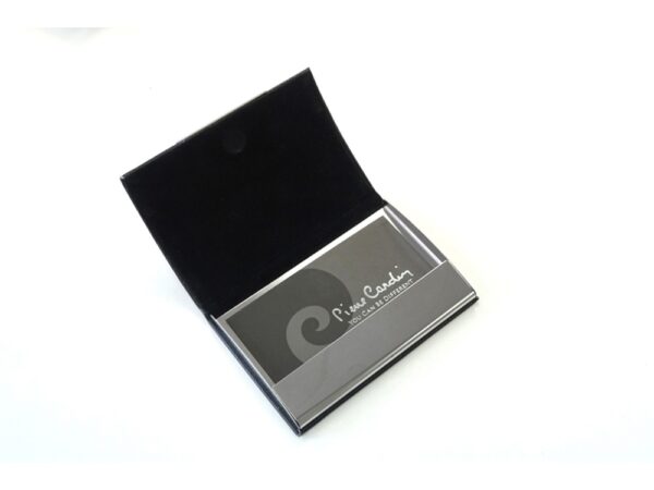 Визитница на магните выполнена из металла с искусственной кожей снаружи и черном бархатом внутри.