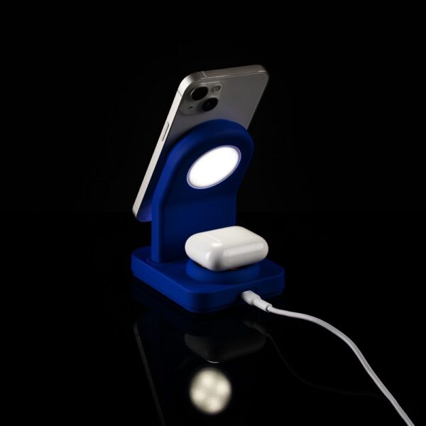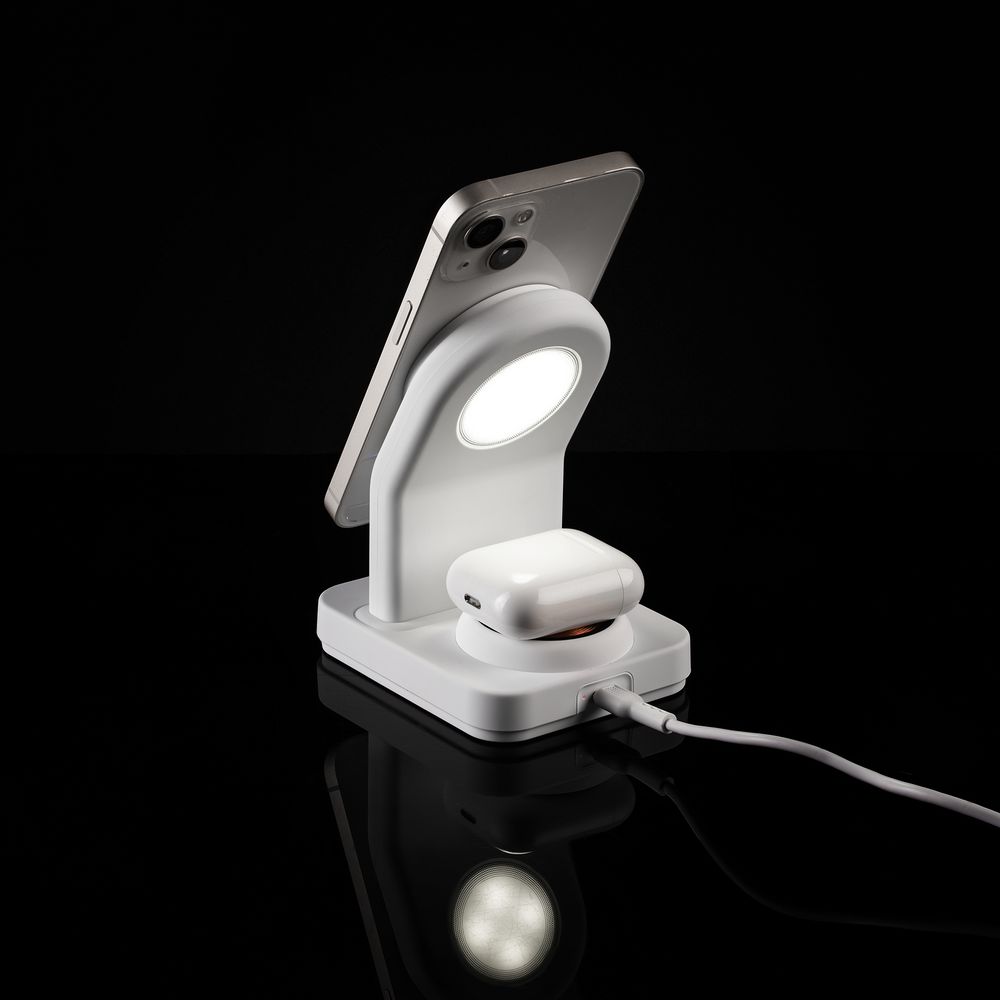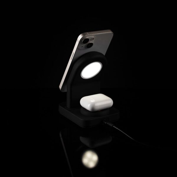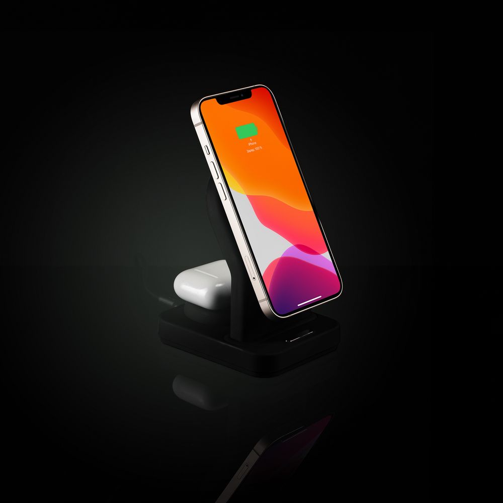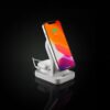iPhone 12–15 c магнитами MagSafe могут удерживаться на основной области станции. Ранние или компактные модели iPhone или смартфоны с диагональю 5,7–6″ на OS Android можно оснастить специальным адаптером Magmate или чехлом со встроенным кольцевым магнитом сзади.